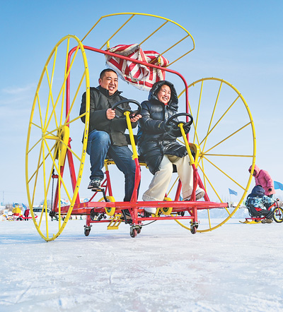 新疆维吾尔自治区昌吉回族自治州呼图壁县五工台镇百泉湖,游客在体验雪地自行车。