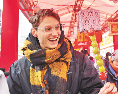 山东省青岛市市北区大鲍岛文化休闲街区糖球会上,一名外国游客在观赏糖球。